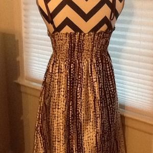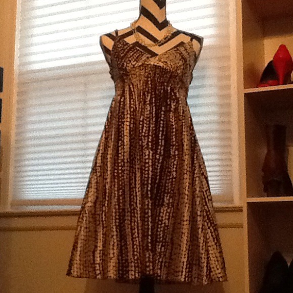 Brown and white speckled print. Elastic empire waist. Cute! Can also be worn maternity.