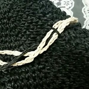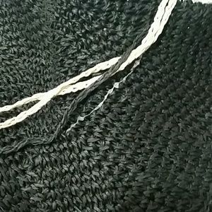 This sun hat has glue showing where the straw ribbon has lifted, but is stitched down