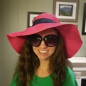 A hat perfect for the beach! A fun pink color with navy blue band featuring the Ralph Lauren emblem. This hat is great for days by the pool or vacations at the beach. It is a Medium and has only been a used 2-3 times.