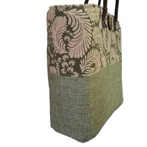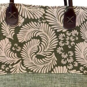 This is a beautiful Sun n Sand Linen and Cotton Tote in grass green linen with Polynesian designed cotton fabric top.