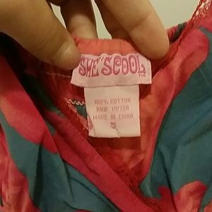 Hawaiian/Floral Print Sun Dress. Straps can be finicky. Never figured them out. Bottom squeezes to legs to prevent lifting.