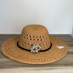 SunHat Woman’s One size fits most tan hat with black hat band bead details