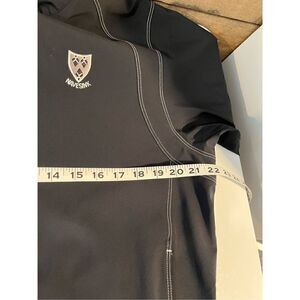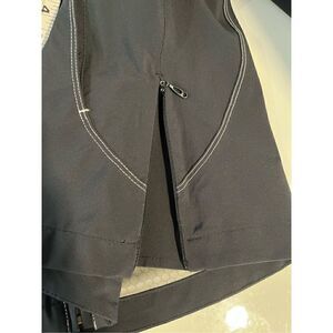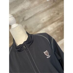 Sun Mountain ladies black Softshell jacket with zip closure and front zip pockets. There are also two zippers to extend the width of necessary. Waterproof. Please note: some of the interior lining is flawed around the lower neck and one of the sleeves is missing the Velcro buckle.