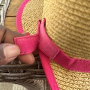 Tan & pink large brim hat adjustable by Velcro with bow detail. In VGUC.