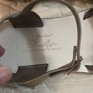 Stylish gold leather sandals featuring a buckle design. Perfect for casual wear.sun san surfer