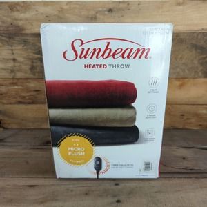 Sunbeam Micro Plush Heated Throw Blanket. Blanket measures 50"x60". It's a beige/taupe color.