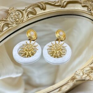 Make a bold, artistic statement with these stunning sunburst drop earrings, crafted from stainless steel and plated with real PVD gold. The top features a natural stone stud, while the oversized white acrylic circle frames a radiant golden sun design — giving celestial goddess energy with a modern twist.