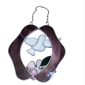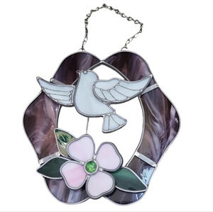 Suncatcher Stained Glass White Dove In Flight Pink Rose Purple Leaded Handmade