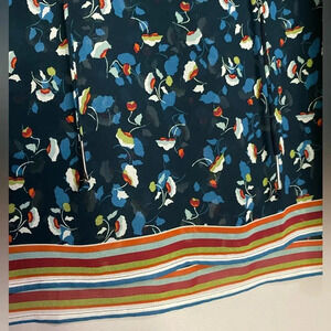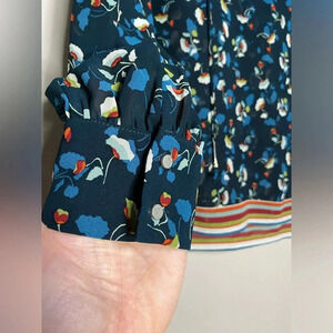 Features: button cuffs; neck tie strings with metal ends; fun colorful floral pattern