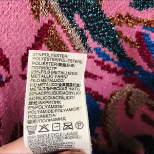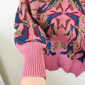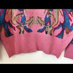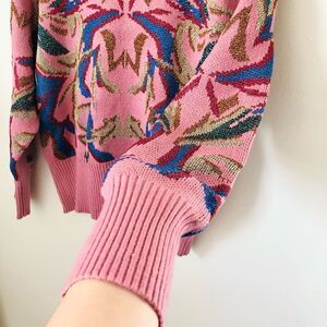 Rose coloured sweater with jewel-tone design. Gold embellishments.