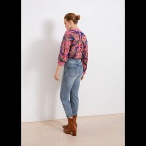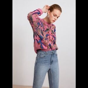 Rose coloured sweater with jewel-tone design. Gold embellishments.