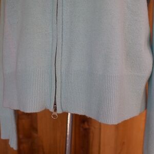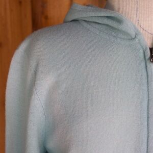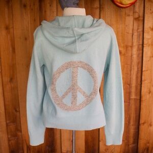 Nearly perfect condition, worn only a few times but has a single spot show in the last photo. The sweetest soft/dusty blue color hoodie, with heather grey peace symbol on the back. Wears loose, size large. Super sophisticated yet casual sweater. Zipper opens at both ends.