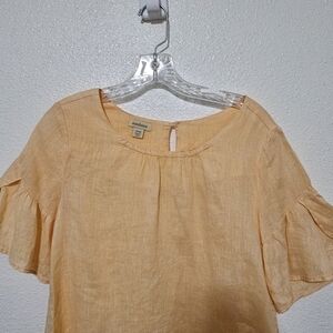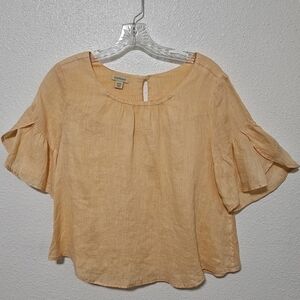 Sundance 100% linen cropped top size pxxs see pics for verification of size very cute split ruffle sleeve see pics for verification of size used no holes or stains measurements approximately flat lay pit to pit 18 1/2 length 21