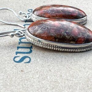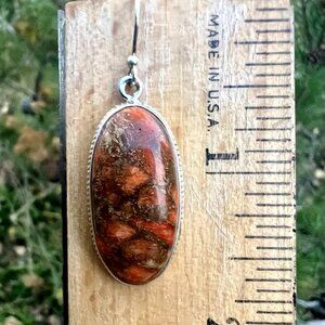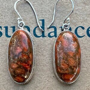Sundance description: "Colors and shapes of the Southwest desert are captured in our 'Monument Valley' orange Mohave turquoise earrings. Vibrant orange copper hues are joined by mossy browns, held in sterling silver bezel frames. Handmade. French wires. 1-5/8" L."