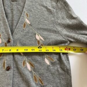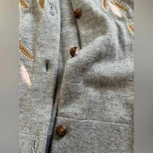 Good preowned condition. Buttons are beaded and the bottom button has beading that is slightly coming off as seen in photo. See photos for sweater dimensions