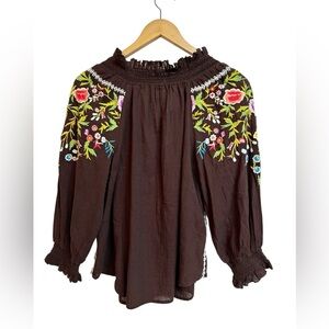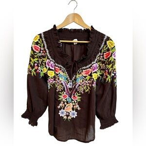 Sundance Amora Blooms Bird Floral Embroidered Boho Top Cotton Brown Small