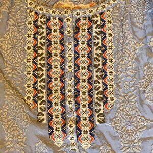 Description: Sundance Ballets Melody Embroidered Detail Blouse. This blouse showcases a stunning symphony of floral and geometric textural embroidery, cross stitching at front and crochet buttons. Bold sleeves with elastic cuffs and ruffle. Viscose. Hand wash. Retailed New at $228