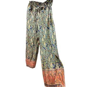 Loose and airy cotton voile creates a relaxed, beachy vibe in these fun and casual pants with contrast printed cuffs and wooden button fly. Side pockets and back patch pockets. Braided fabric belt included. Cotton. Machine wash. Imported