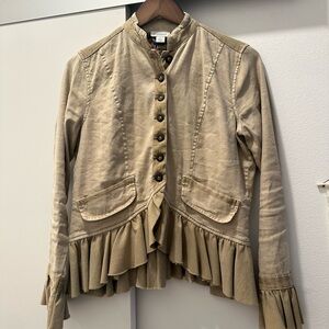 Stylish blazer with ruffled hem. Button-up front. Ideal for versatile wear.
