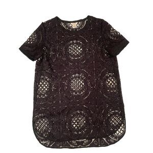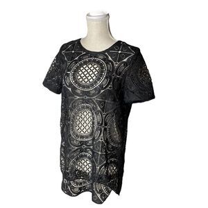 Sundance Black Shadow Dance Crochet Eyelet Top. Features semi sheer black crochet top. Short sleeves. Crew round neck. Beautiful design in the crochet. Tunic style. Does not include cami and will need a cami or slip underneath for modesty.