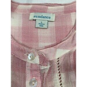 The Sundance Blouse in size L is a stylish and versatile addition to any woman's wardrobe. With its gingham check pattern, tissue light fabric, and 3/4 sleeves, it is perfect for casual occasions or travel during the summer, fall, or spring seasons. The pink color, pin-tucked accents, and bow detail add a touch of bohemian charm to this lightweight and comfortable tunic-style blouse from Sundance. Made from 100% cotton with a relaxed fit, this blouse offers both style and ease for everyday wear.