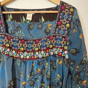 Sundance Blue Floral Embroidered Silk Tunic Top Women's Size Medium