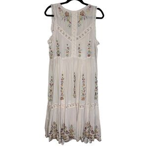 DETAILS: Ivory base with colorful floral embroidery along bodice, skirt panels, and hem, V-neckline with embroidered trim, sleeveless with ruffle detail, tiered skirt with crochet lace inserts, empire waist seam, maxi length, fully lined bodice with attached slip. The embroidery features flowers in rust, blue, yellow creating folk art aesthetic.