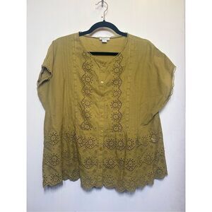 EUC Sundance green boho button down short sleeve blouse size S but oversized could fit a M. 100% cottons eyelet lace details.