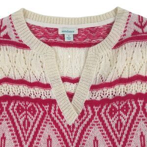 Sundance Brixen Fair Isle V-Neck Sweater Womens Size Medium Wool Blend Pointelle Knit Pink White Pullover
