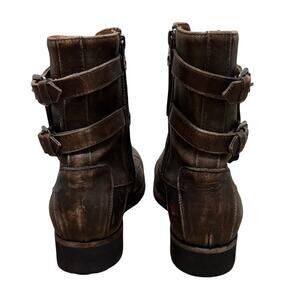 Brown distressed leather with chunky studded straps + buckles. Lace-up + side zip for easy wear. Rugged moto vibes, perfect with jeans or dresses.