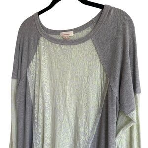 Casual, lightweight top from Boden. The body and sleeves are a soft, faded burnout fabric with a subtle paisley print throughout, while the shoulders, sides, and cuffs are a gray ribbed fabric. Size Medium and in good preowned condition; no visible flaws.
