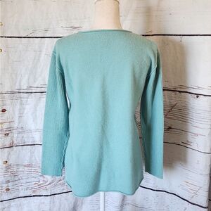 Aqua color cashmere sweater with ribbed sleeves and side slits. In good condition with light pilling throughout.