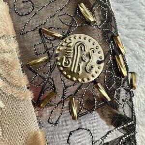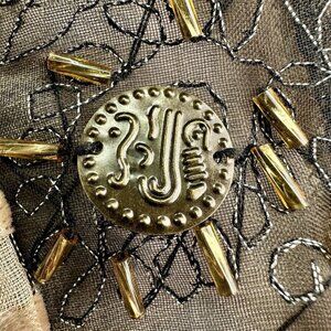 Gorgeous fully lined warm brown/tan velvety print knee length sheath dress. Beading and lace circle the neck. Lace, beads and decorative coins going down both sleeves. Size 6. Gold lace hem. Stunning piece!