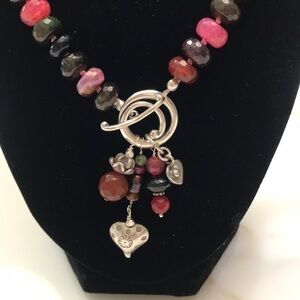 Beautiful rainbow agate hand knotted necklace. Pretty drops dangle from the sterling silver toggle clasp. All findings, beads, clasp etc. are sterling silver. The stones are a 10 mm faceted rondell knotted with pink silk cord. This piece is new and in excellent condition. These colors go with everything. I am a jewelry artist for Sundance catalog and I am selling pieces from my personal collection. More to come.