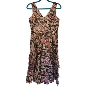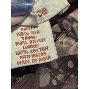 Vintage Sundance Catalog Y2K 100% Silk Floral V-Neck Ruffle Satin Sleeveless Dress| Brown, White and Pink Colorway | 4 | EUC | MSRP $139 | Lined | Dry Clean Only | Hidden Zipper Closure | Measurements Laying Flat and Unstretched: Pit to pit 18" | Length 41" | Waist 14.5" |
