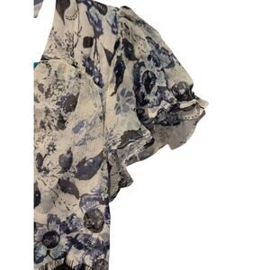 MSRP $148 | Lined | V-neckline | Flutter Sleeve | Measurements Laying Flat and Unstretched: Pit to pit 15" | Length 39" | Sleeve Length 5" | Waist 13.5" | White, Black, and Blue Corduroy.