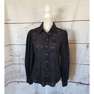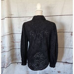 A black semi-fitted body with dramatic blouson sleeves makes a statement on allover-eyelet, shell button front shirt. With tonal stitching, button cuffs, and button front. In very good condition. Does not include a cami.