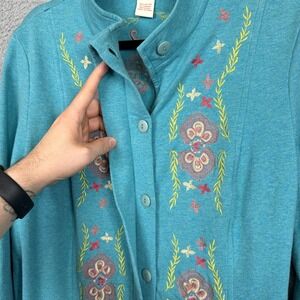 Add a touch of boho charm to your wardrobe with this Sundance embroidered longline jacket. Made from a soft cotton-spandex blend, this piece combines comfort with artistic detail. Featuring a stand collar and beautiful floral embroidery along the front, back, and sleeves, it's the perfect layering piece for casual or dressy occasions. The teal blue fabric offers a vibrant backdrop for the colorful embroidery, while side pockets add functionality.