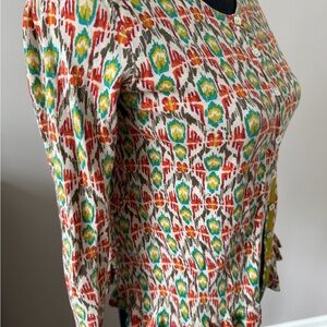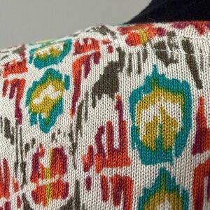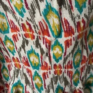 Sundance Colorful Patterned Button-Up Cardigan in size Small is a vibrant, art-inspired piece that adds warmth and personality to any wardrobe. The stunning mix of turquoises, olive, orange, and red creates a beautifully layered pattern that feels both earthy and bold. Fun square buttons add unique character down the front, while slight pleating at the cuffs and hemline provides subtle shaping and feminine detail. Crafted in comfortable cotton, it offers breathable softness you can enjoy year-round. Pit-to-pit measures 18" lying flat and length is 21", giving it a slightly cropped silhouette that pairs perfectly with high-rise styles.