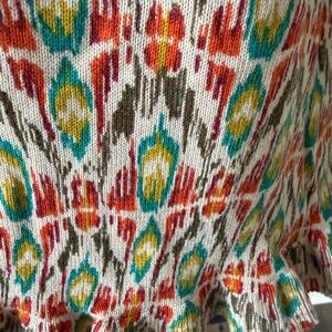 A gorgeous blend of turquoise, olive, orange, and red gives this cardigan rich, artistic charm.