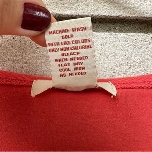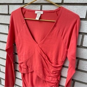 Sundance, surplice top, coral pink, coral orange, balletcore, long sleeve, ruched, wrap top, V-neck, size small, softgirl, casual top, layering tee, stretchy cotton, comfy, cozycore, lounge top, fitted, draped, feminine style, romantic, basic essential, lightweight, transitional piece