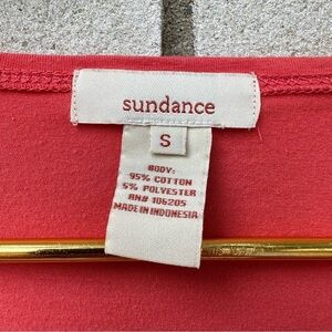 Flattering and feminine Sundance surplice top in a vibrant coral orange shade. Features a deep V-neckline, long sleeves, and a ruched wrap-style front with gathered side panels for a softly draped effect. Slightly longer tunic-style length makes it easy to dress up or down. Made from a soft and breathable 95% cotton, 5% polyester blend. Tag size Small. In great pre-owned condition with only minor wash wear.