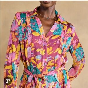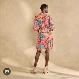 Step into elegance with this Sundance dress featuring a vibrant mix of pink and orange hues. In Pinot Noir color, this dress is a knee length transitional piece made from a feathery light plant based chiffon fabric (cupro) in an earthy floral print.