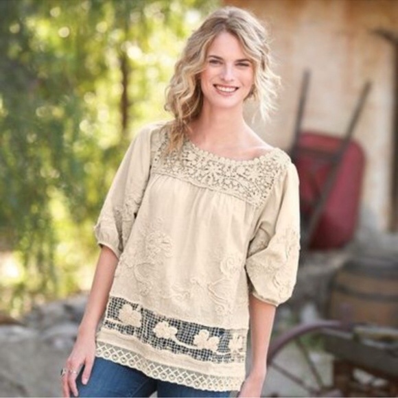 Sundance Cream Boxy Blouse with 3/4 Sleeves and Embellished Details