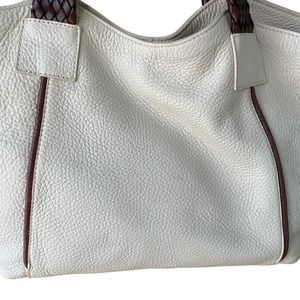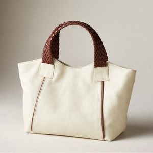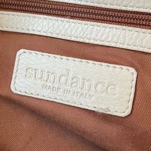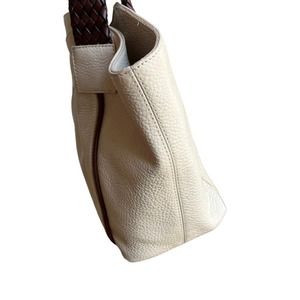 Elegant Sundance shoulder bag. Cream body with braided brown handles. Perfect for any occasion.