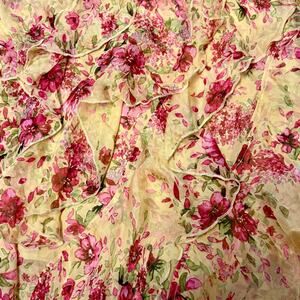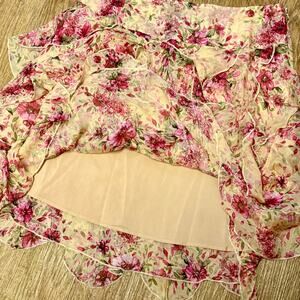 • Other information: Eye catching multicolored floral silk midi skirt with ruffles throughout. Sheer ruffle fabric overlayed with lined skirt. Side hook and eye closure plus zipper. No stretch and no pockets. Dry clean.