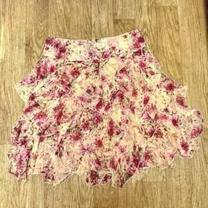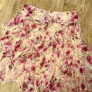 Sundance Cream and Pink Floral Ruffle Silk Midi Skirt Size 16