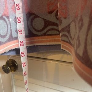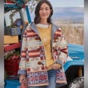 Warm up in this hooded, felt style, blanket coat from Sundance. Oversized and boxy southwest print with faux leather toggle closures, cowgirl chic. Bright southwester print, with raw seams and side pockets.