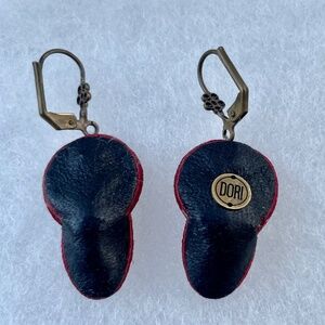 This is a beautiful pair of Dori Csengeri earrings featuring purple and red silky cords in teardrop and circle shapes with orange and red crystals and glass. The earrings are 2 inches by .5 inch.