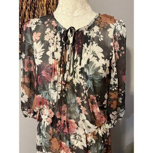This pretty dress is from Sundance in a petite size medium. Made of pure sheer silk. There is no slip and you will need one. Pullover style with smocked elastic waist. Drawstring tie at the neck. Sleeve ends have tiny elastic section. Unstretched, measured from seam to seam across the front: